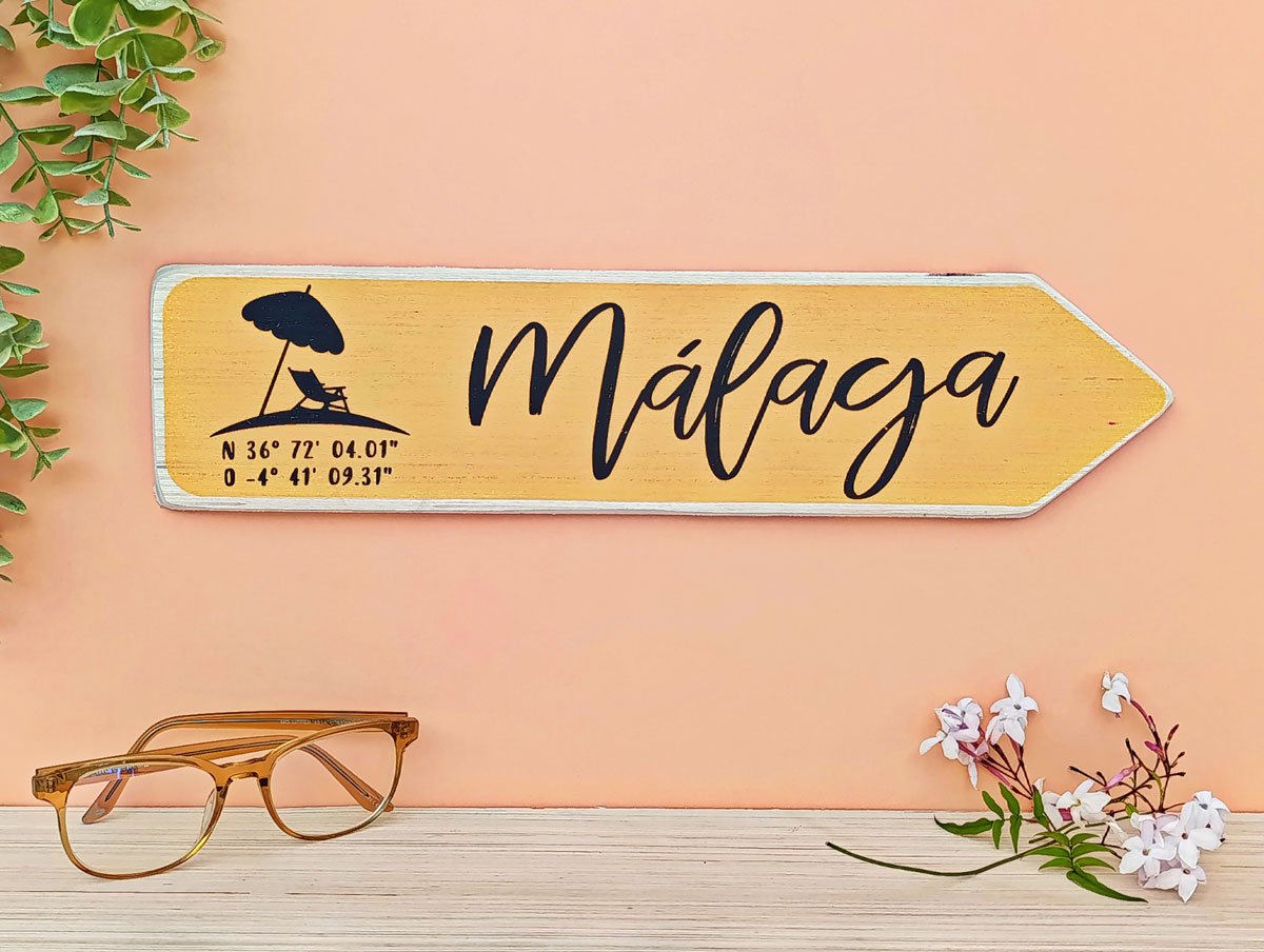 Cartel estampado manualmente con Serigrafía listo para colgar con el nombre de ciudades, coordenadas del lugar y algún símbolo de referencia. Medidas (alto x largo x prof.): 9,5 x 40 x 1 cm
